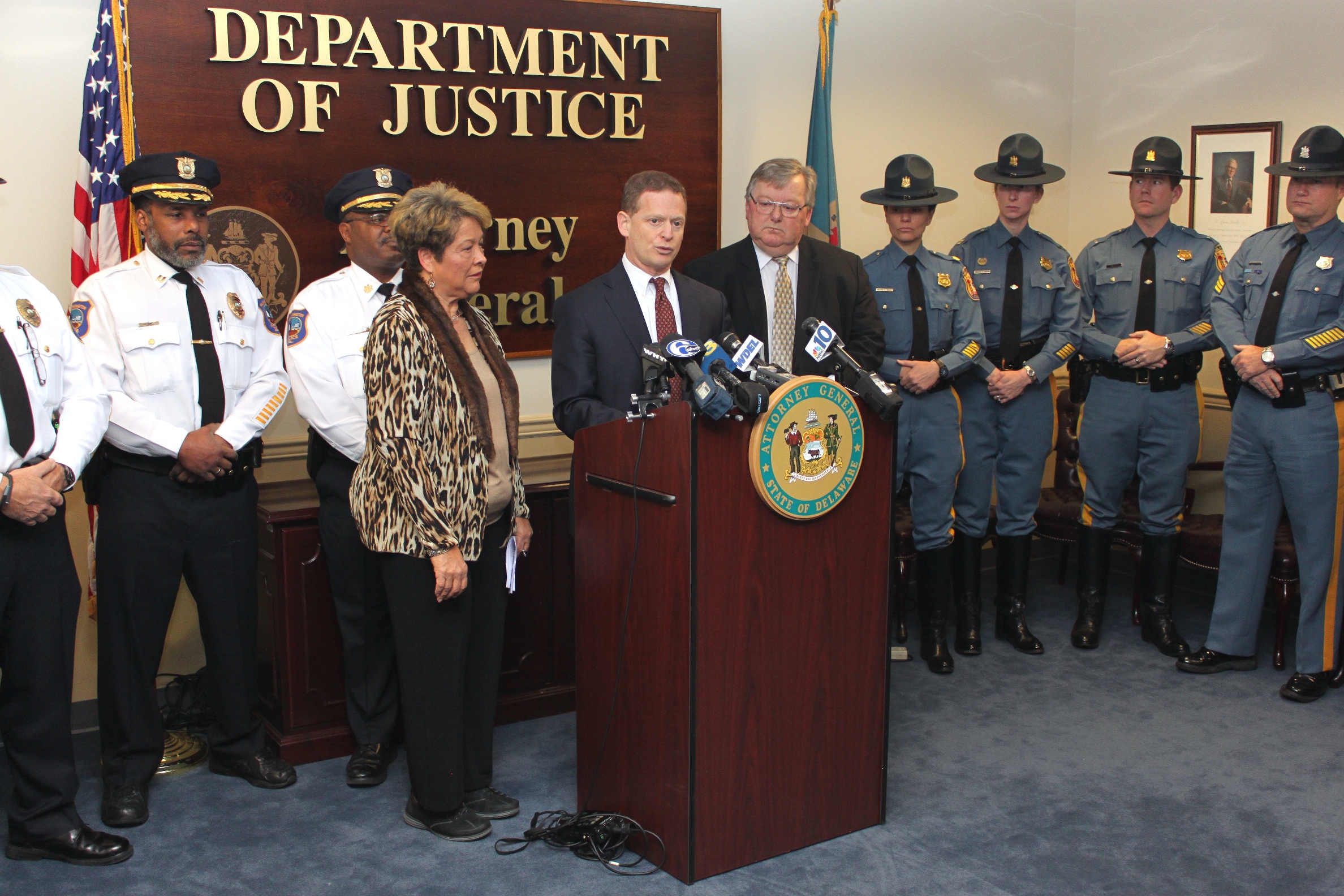Attorney General Matt Denn announces legislation mandating prison time for offenders carrying illegal weapons. Denn is pictured with Senator Margaret Rose Henry and Representative Larry Mitchell, both sponsors of the bill, and representatives from local law enforcement.